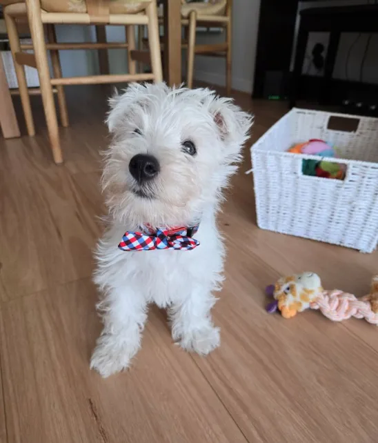 We picked up our Westie, Arnie, in June 2015, and he has been the perfect addition to our family. The entire process was a joy, with great communication and expert advice. You guided us on the best timing for a puppy with a newborn at home, recommending we wait until our daughter was two. You kept us updated throughout the entire journey—from conception to birth—and helped us choose the perfect pup.Arnie is everything we hoped for—loyal, loving, and full of personality. He’s part of every moment, whether playing with our daughter or lounging in the sun. He’s a true Westie, both in looks and attitude, and constantly receives compliments. We couldn’t imagine our family without him and wouldn’t hesitate to get another Westie from you!